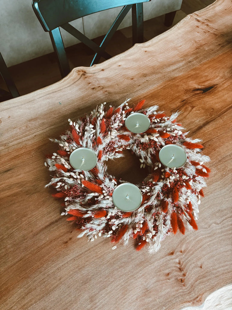 Adventskranz Trockenblumen – Handgemacht in Rot, Beige & Braun | 30 cm mit Kerzenhaltern