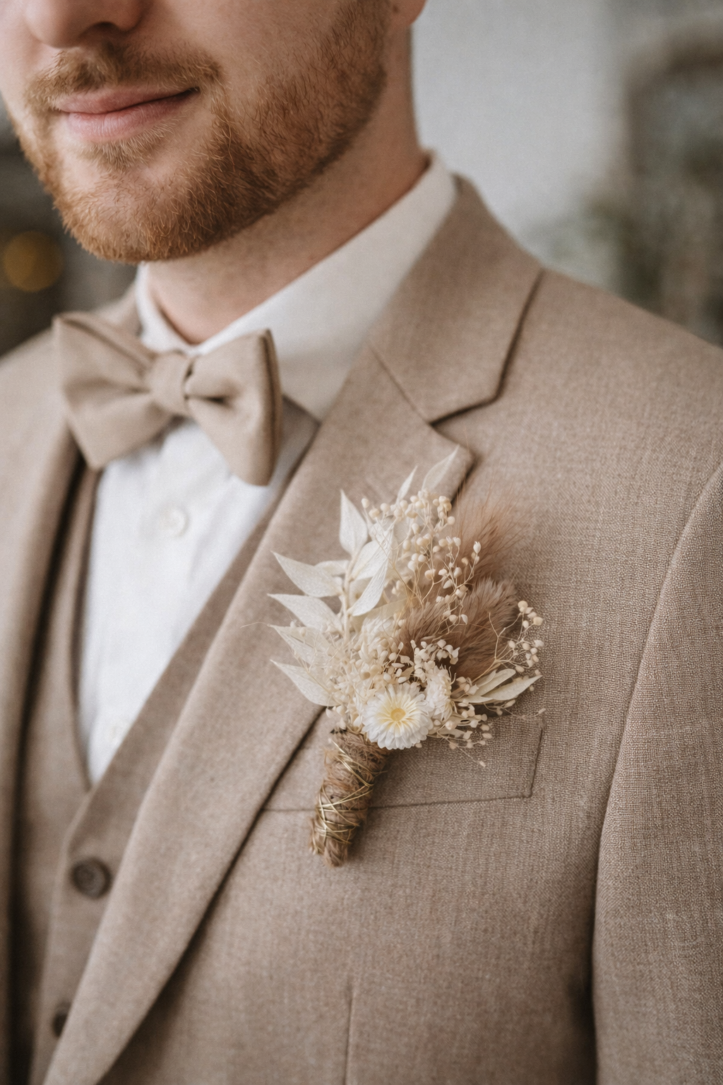 Die sorgfältig ausgewählten Trockenblumen werden zu einem harmonischen, stilvollen Arrangement zusammengestellt und verleihen dem Anzug des Bräutigams eine besondere, natürliche Note. Ideal für Boho-, Vintage- oder naturinspirierte Hochzeiten.