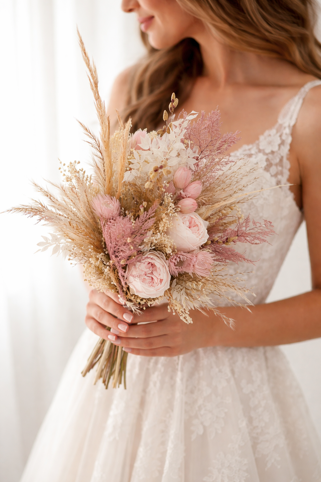 Ob Boho-Hochzeit, freie Trauung, Standesamt oder Vintage-Hochzeit – dieser Brautstrauß aus Trockenblumen in Beige und Rosa fügt sich harmonisch in jedes Hochzeitskonzept ein und ergänzt Brautkleider in Creme-, Ivory- oder Rosétönen besonders schön.