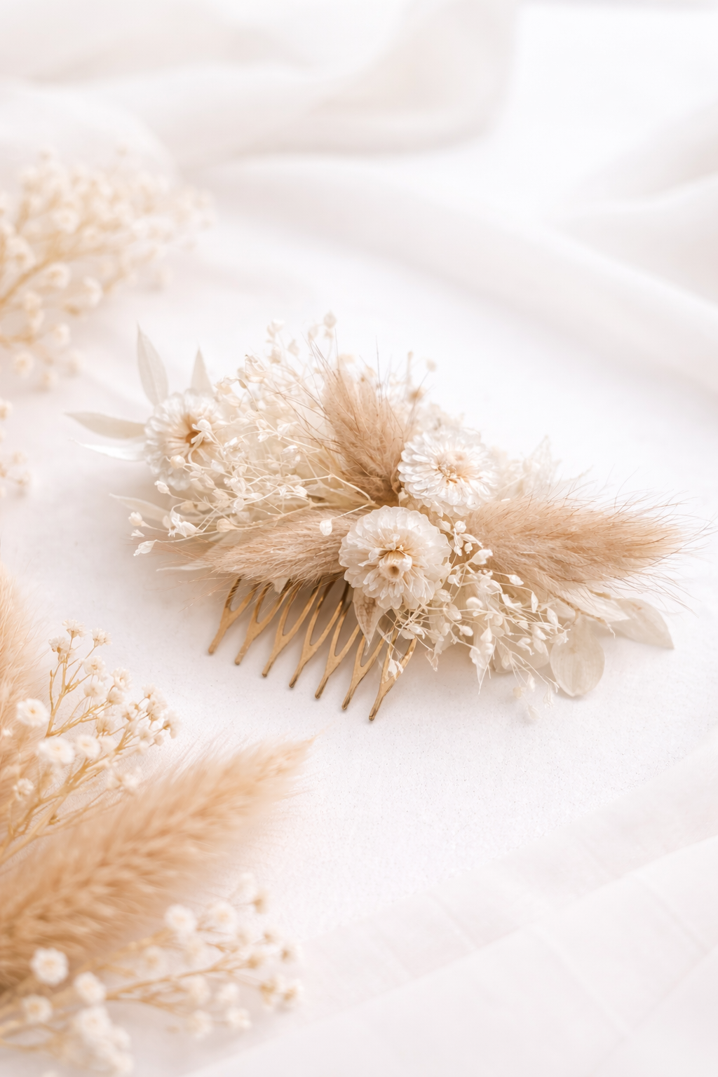 Der Haarkamm aus Metall wird sorgfältig mit ausgewählten echten Trockenblumen in hellen, natürlichen Tönen verziert. Jede einzelne Blume wird behutsam getrocknet und arrangiert, um ihre natürliche Form und Farbe bestmöglich zu bewahren. Da jeder Haarkamm handgefertigt ist, entsteht ein echtes Unikat – die Anordnung der Trockenblumen kann leicht variieren und macht jedes Stück einzigartig 🌾